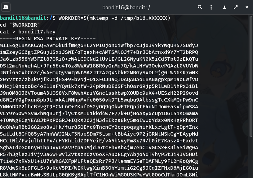 WORKDIR=$(mktemp -d /tmp/b16.XXXXXX) cd "$WORKDIR" cat > bandit17.key # paste the whole block: # -----BEGIN RSA PRIVATE KEY----- # ... # -----END RSA PRIVATE KEY----- # then press Ctrl+D